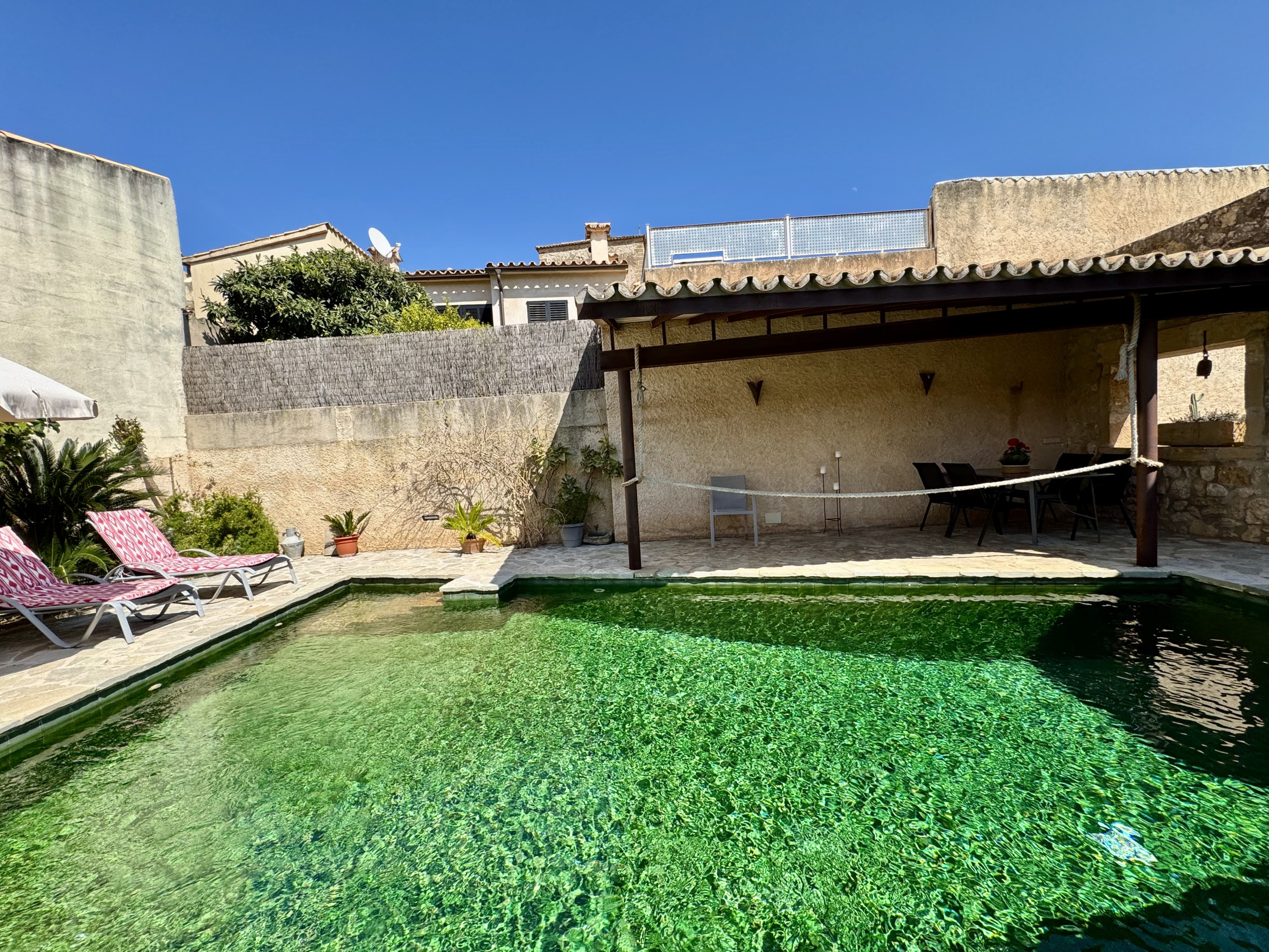 The swimming pool area has comfortable sun loungers, a small chill out area shaded by a tree, and a covered terrace with traditional barbecue, table and chairs, to enjoy summer meals with family and friends.